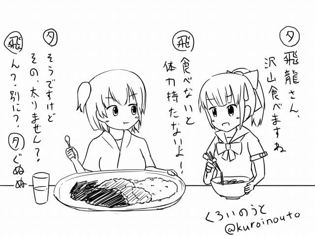 夕張さんは夕張名物カレー蕎麦。飛龍さんはどこかの大盛りカツカレーを食べてます。